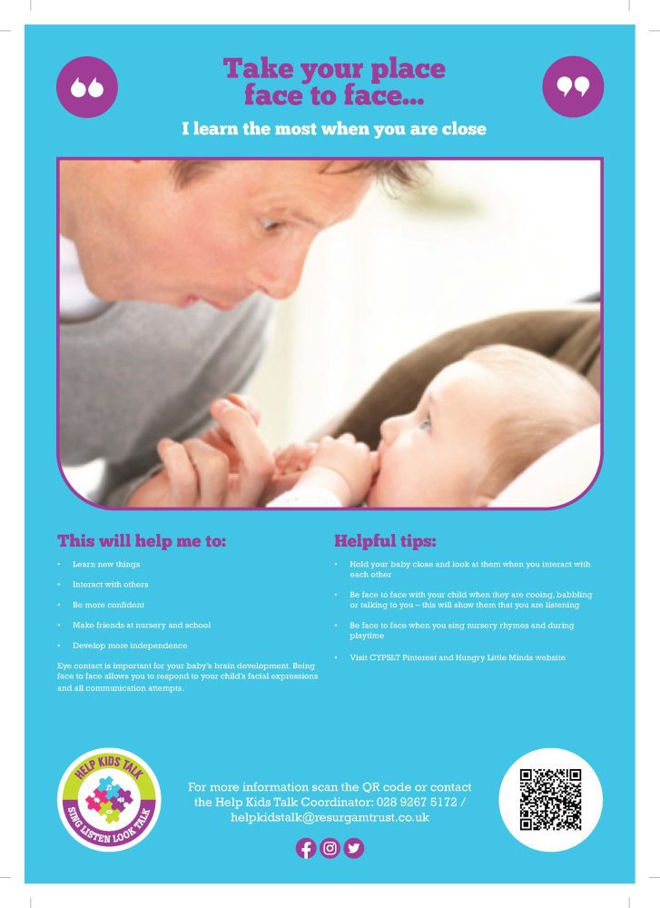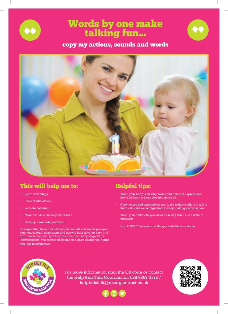 By responding to your child’s actions, sounds and words you open communication & turn taking, and this will help develop back and forth ‘conversations’ right from the new-born baby stage. Early ‘conversations’ may consist of smiling or a baby waving their arms and legs in excitement.