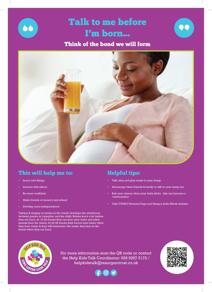 Talking & singing to babies in the womb develops the attachment between parent or caregiver and the child. Babies learn a lot before they are born. At 16-20 weeks they can hear your voice and other sounds from the womb. At 24-28 weeks their hearts beat faster when they hear music & they will remember the music they hear in the womb when they are born.