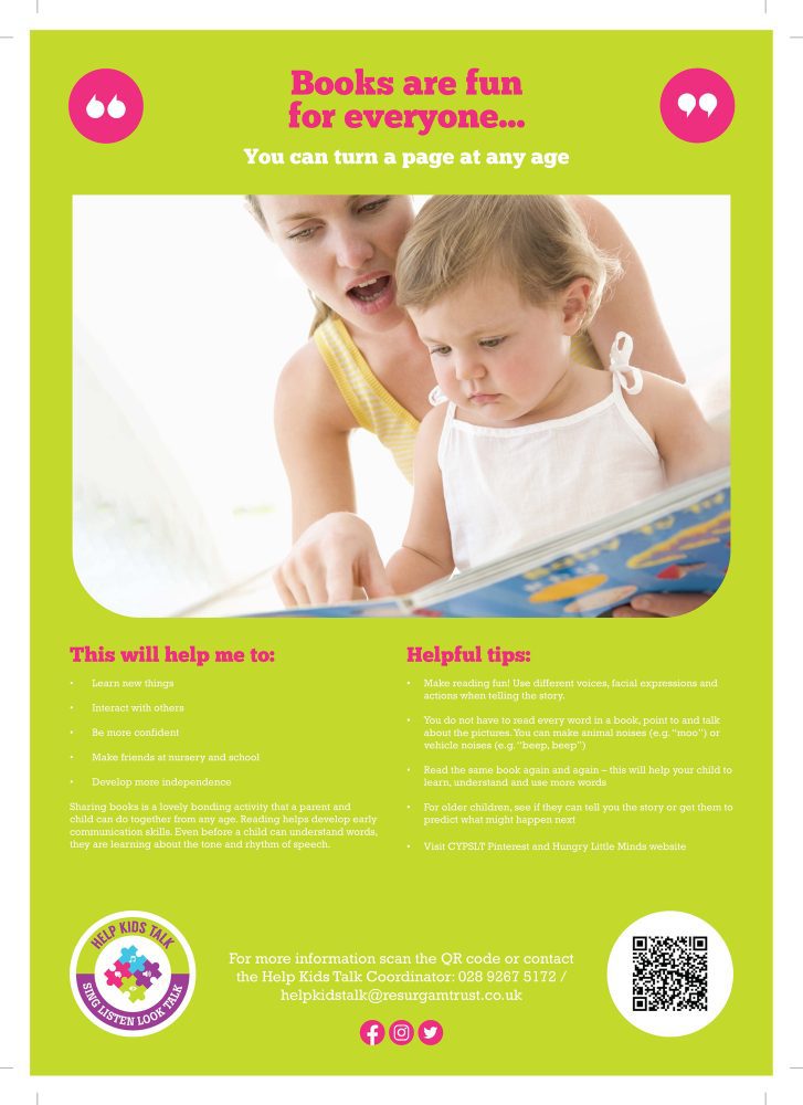 Sharing books is a lovely bonding activity that a parent and child can do together from any age. Reading helps develop early communication skills. Even before a child can understand words, they are learning about the tone and rhythm of speech.