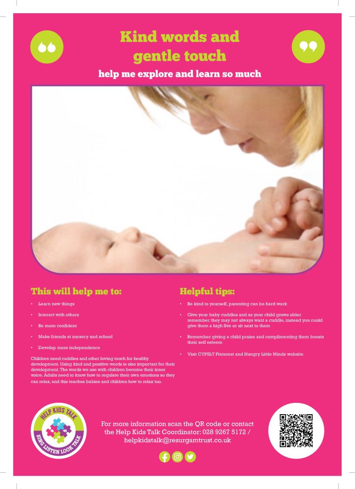 Children need cuddles and other loving touch for healthy development. Using kind and positive words is also important for their development. The words we use with children become their inner voice. Adults need to know how to regulate their own emotions so they can relax, and this teaches babies and children how to relax too.