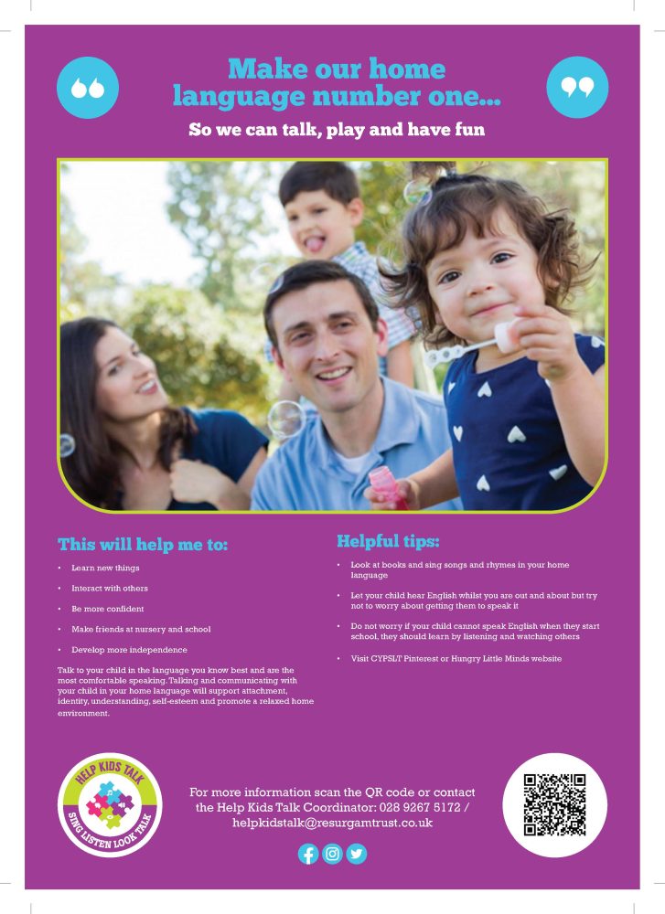 Talk to your child in the language you know best and are the most comfortable speaking. Talking and communicating with your child in your home language will support attachment, identity, understanding, self-esteem and promote a relaxed home environment.