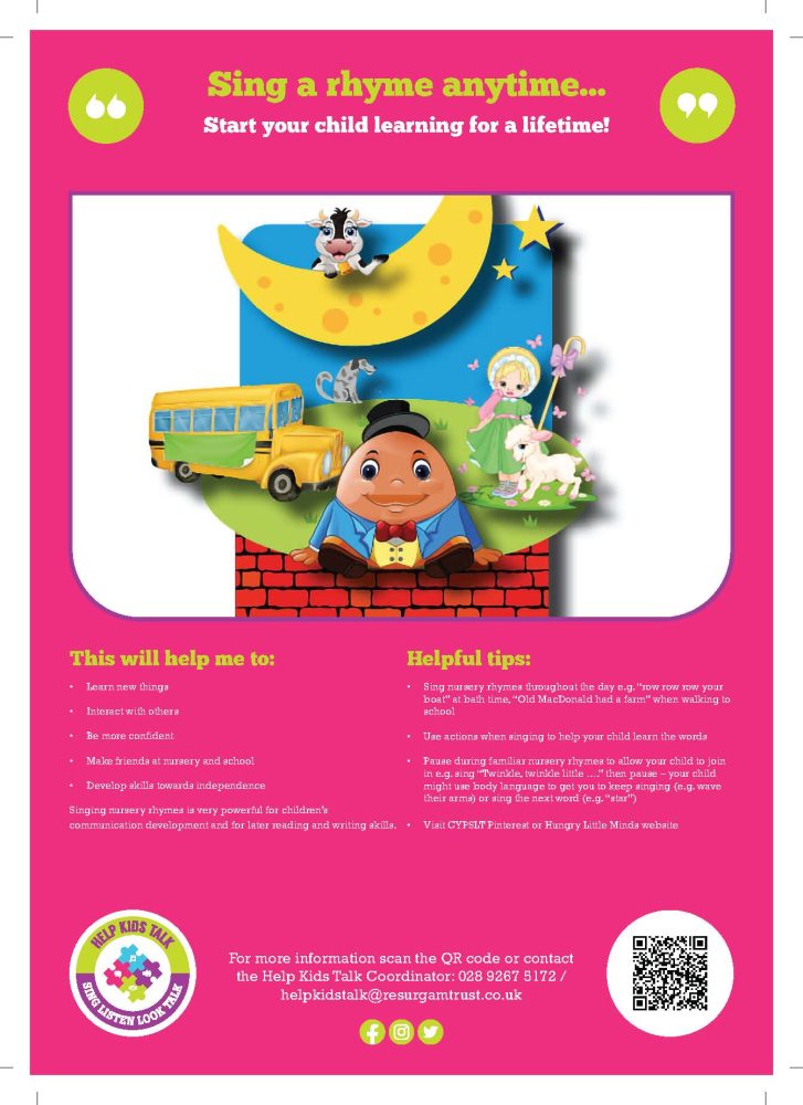 Singing nursery rhymes and action songs is a great way for your child to hear lots of sounds and words. When babies and toddlers know nursery rhymes this helps to support their later reading and writing skills.