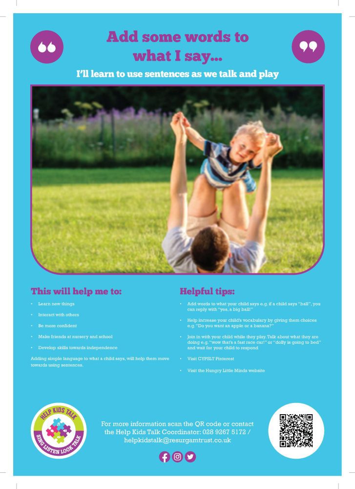 Add some words to what I say, I’ll learn to use sentences as we talk and play